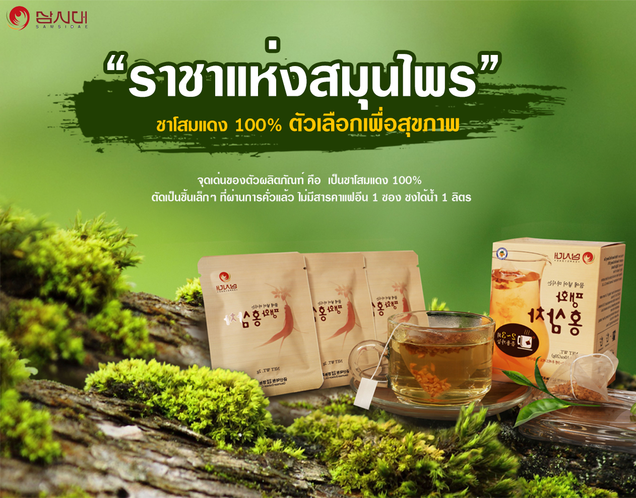 จุดเด่นของตัวผลิตภัณฑ์คือ : เป็นชาโสมแดง 100% ตัดเป็นชิ้นเล็กๆ ที่ผ่านการคั่วแล้ว ไม่มีสารคาแฟอีน 1 ซอง ชงได้น้ำ 1 ลิตร
